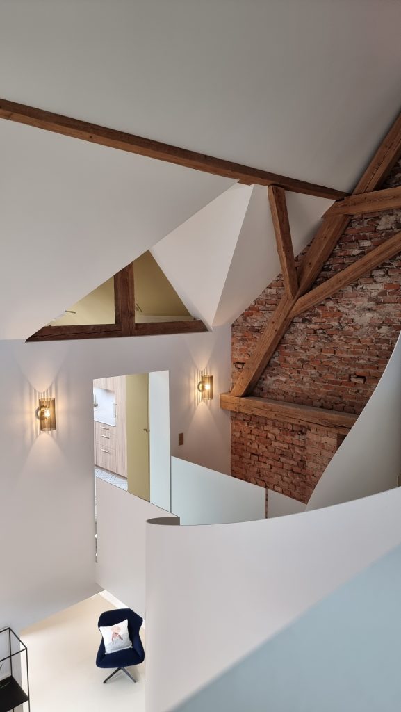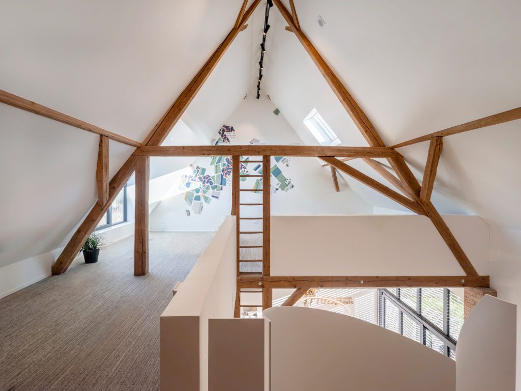 Baigné de lumière, le plateau ouvert bénéficie d’une belle hauteur sous plafond. Il s’en dégage une atmosphère chaleureuse sublimée par une charpente apparente, et feutrée grâce à la moquette au sol.